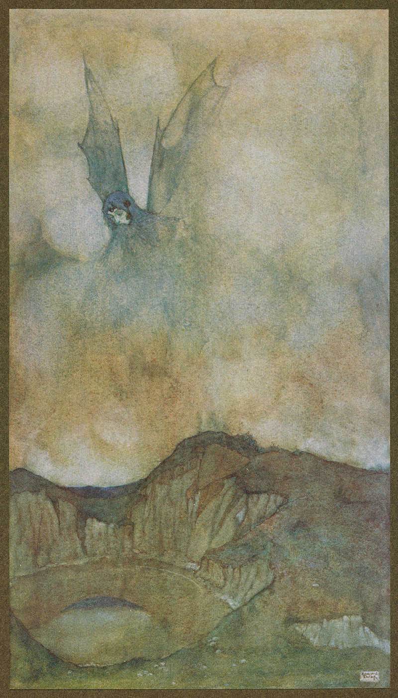 Thus reckoning, he prised out the stopper with his knife, and turning the vessel upside down looked for the contents to follow. Great was his astonishment when nothing but smoke came out of it. The smoke rose in a thick black column and spread like a mist between earth and sky, till presently, drawing together, it took form; and there in its midst stood a mighty Genie, whose brows touched heaven while his feet rested upon ground. His head was like a dome, his hands were like flails, and his legs like pine trees; his mouth was black as a cavern, [Pg 3]his nostrils were like trumpets, his eyes blazed like torches, and his wings whirled round and over him like the simoom of the desert.