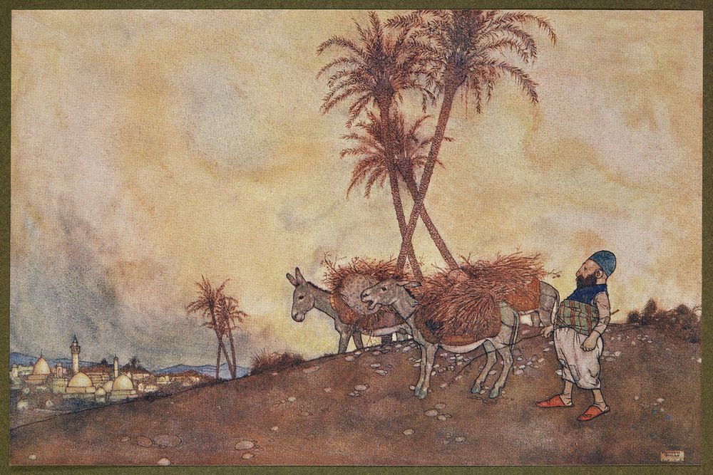 The Prince accordingly ordered the merchants each to take what he recognized as his own; and this being done he divided the rest equally between them. The question then arose how they should remove their plunder from a place so desolately situated, where it would seem impossible to procure means of conveyance; but on a further search they found not only the camels of the merchants, but also the horses on which the Princes of Harran had ridden; and as, [Pg 110]at their approach the black slaves who were in charge of the stables fell into headlong flight, Codadad and his companions found themselves left in undisputed possession. The merchants therefore loaded their camels, and with renewed protestations of gratitude departed on the several roads by which their avocations called them.