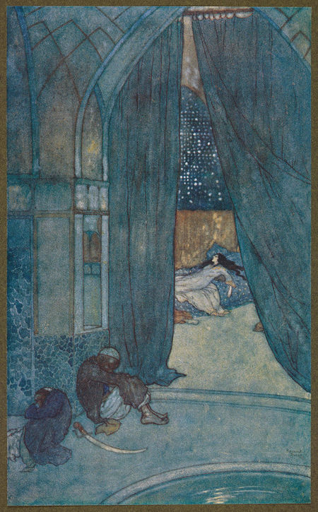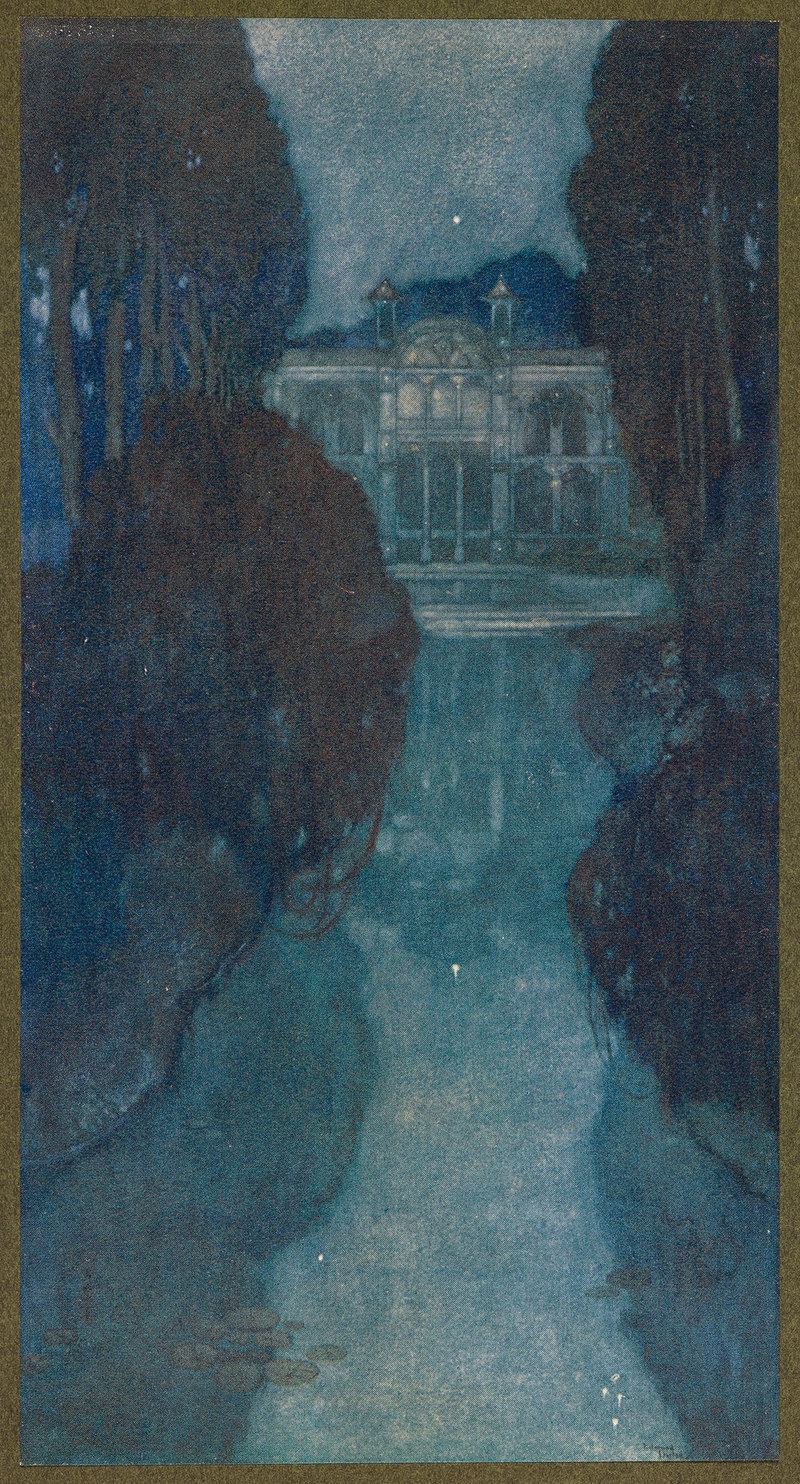 So the princess consenting, they went down and sat by the lake and solaced themselves sweetly with love till it was evening. Then they rose up and mounted once more upon the magic horse and came by night to the outskirts of the city where dwelt the King of Persia. Now in the garden of the summer palace which stood without the walls all was silence and solitude, and coming thither unperceived the King's son led the princess to a pavilion, the door of which lay open, and placing before it the magic horse he bade her stay within and keep watch till his messenger should come to take her to the palace which he would cause to be prepared for her.