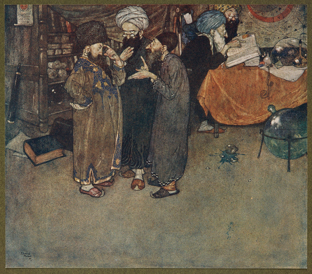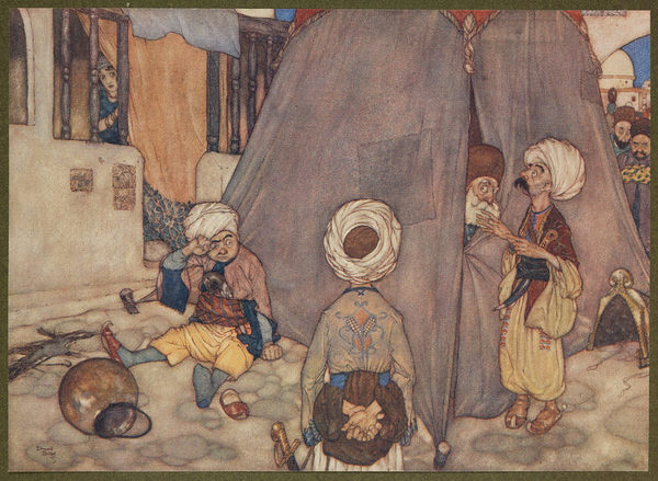 The Genie was ready enough to give the oath as desired. Then said the fisherman, "How is it that one so great as thou art, whose feet o'er-step the hills and whose head out-tops the heaven—how can such an one enter into so small a vessel to dwell in it? Truly, though mine eyes tell me I have seen it, I cannot any longer believe so great a marvel."