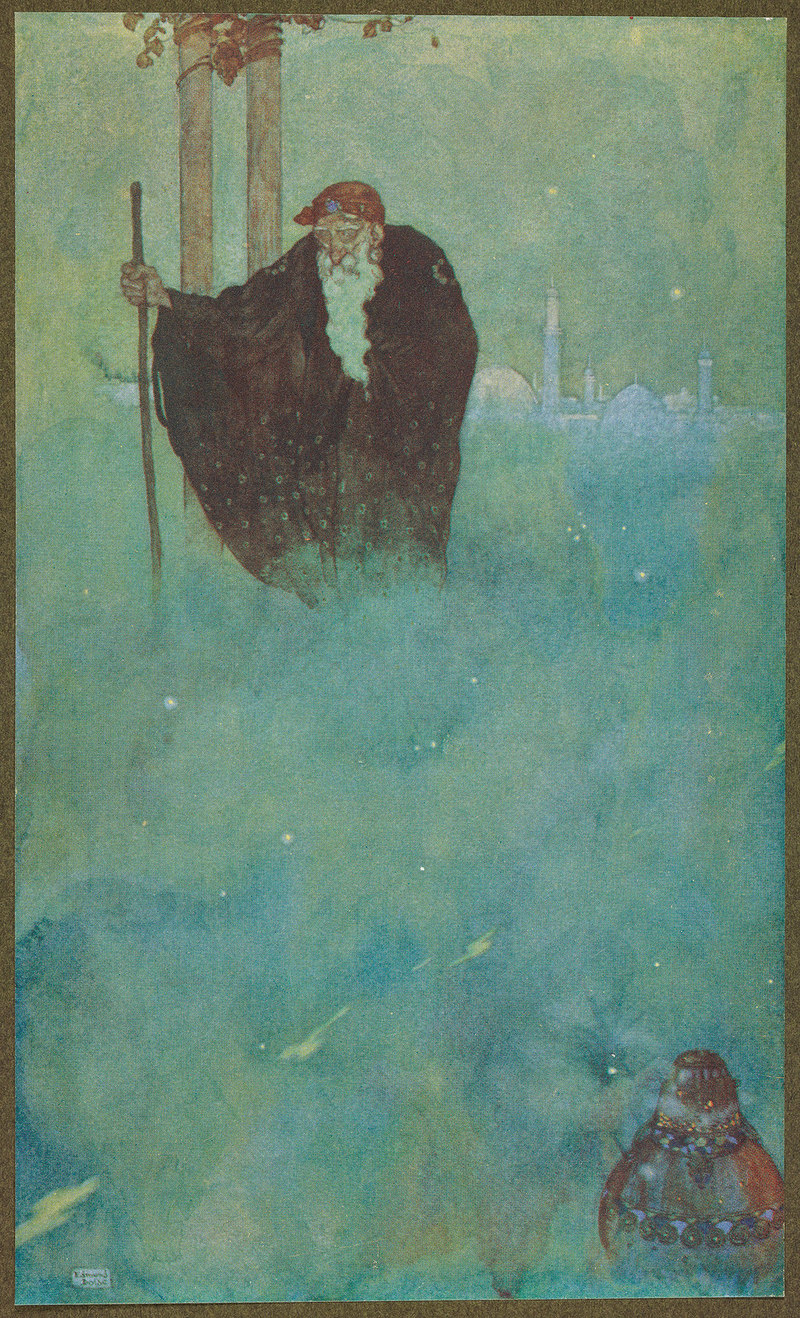 "Now when I had lain there prisoner for a hundred years, I swore in my heart that I would give to the man that should release me all the treasures attainable in heaven or earth. But when none came to earn so great a reward in all the hundred years that followed, then I swore that I would give to my liberator earthly riches only; and when this gift also had lain despised for yet another hundred years, then would I promise no more than the fulfilment of three wishes. But thereafter finding that all promises and vows were vain, my heart became consumed with rage, and I swore by Allah that I would only grant to the fool that should release me his own choice of the most cruel form of death by which he should die. Now therefore accept that mercy which I still offer and choose thy penalty!"