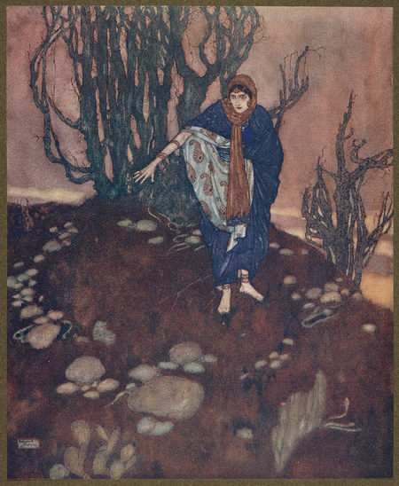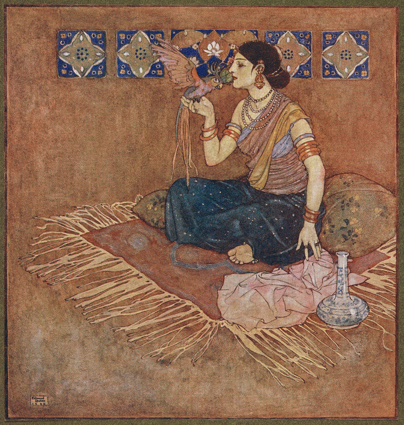 Now the Indian was of a form altogether [Pg 89]hideous and abominable. The princess looked at him, therefore, in surprise, saying, "Could not the King's son find any one to send to me but thee?" The sage laughed, for he read the meaning of her words. "O searcher of hearts," he said, "do not wonder that the prince hath sent to thee a man whose looks are unattractive, for because of his love toward thee he is grown exceeding jealous. Were it otherwise, I doubt not that he would have chosen the highest and most honourable in the land; but, being what I am, he has preferred to make me his messenger."