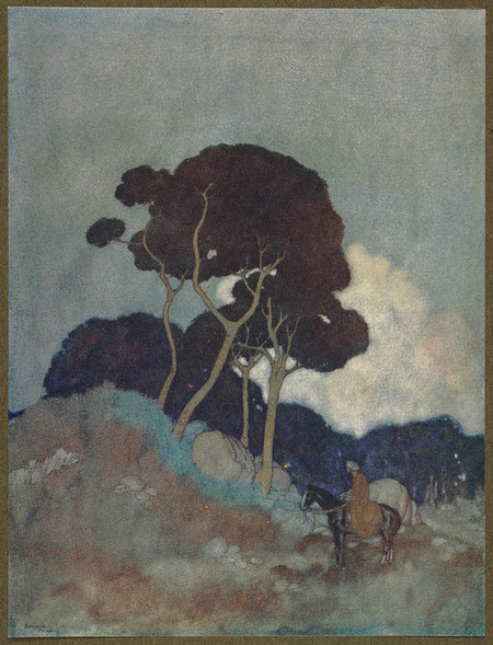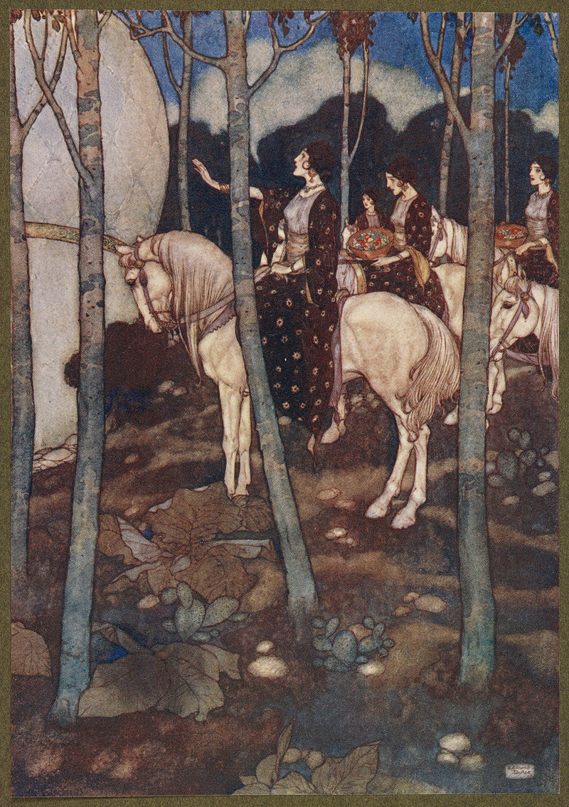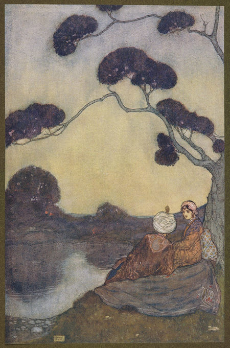 But as they travelled the day grew hot and the sun burned fiercely upon them; and the prince looking down beheld a green meadow by the side of a lake; so he said, "O desire of my heart, let [Pg 85]us go down into yonder meadow and seek rest and refreshment, and there let us wait till it is evening, so that we may come unperceived to my fathers palace; and when I have brought thee thither safely and secretly, then will I make preparation so that thou mayest appear at my fathers court in such a manner as befits thy rank."