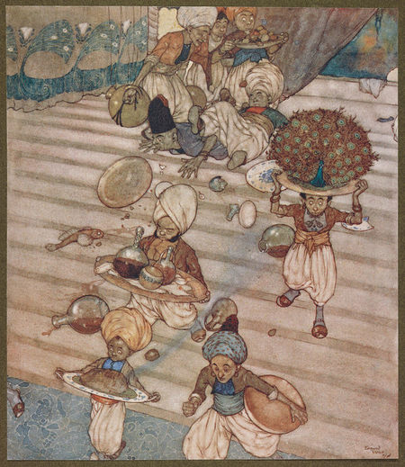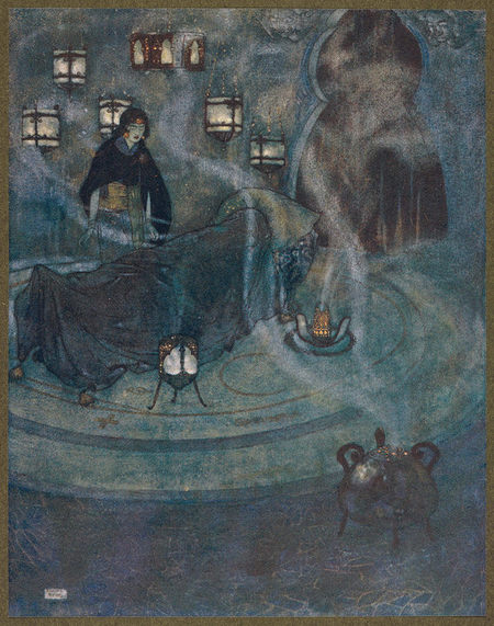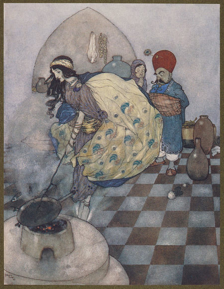 The cook meanwhile, proud of an opportunity to exhibit her culinary skill on dainties so rare, scaled and cleaned the fish and laid them in a frying-pan over the fire. But scarcely had she done so when the wall of the kitchen divided, and there issued forth from it a damsel of moon-like beauty richly apparelled, holding a rod of myrtle in her hand. With this she struck the fish that lay in the frying-pan, and cried—