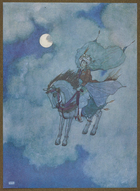 So early on the morrow they brought the horse from the royal treasury, and the princess from her chamber, and carried them to the place where they were first found; and all about, a great [Pg 99]crowd of the populace was gathered to behold the sight. Then Prince Firouz Schah took the princess and set her upon the horse, and leaping into the saddle before her he turned the pin of ascent, and immediately the horse rose with a great sound into the air, and hung above the heads of the affrighted populace. And the King's son leaned down from the saddle and cried in a loud voice, "O Sultan of Cashmire, when you wish to espouse princesses which seek your protection, learn first to obtain their consent." And so saying he put the horse to its topmost speed, and like an arrow on the wind he and the princess were borne away, and passed and vanished, and were no more seen in that land.