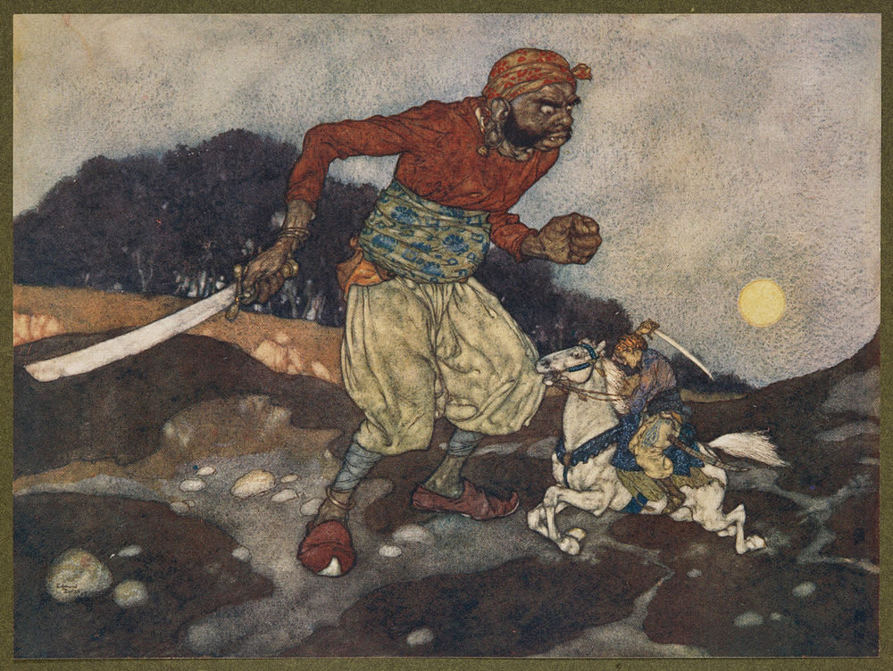 But even as she spoke, the negro, a horrible and gigantic monster of loathsome appearance, came in sight moving rapidly toward the palace. No sooner had he caught sight of the Prince than he rushed upon him with growls of fury, and drawing his scimitar aimed at him a blow which, had it found him, must there and then have [Pg 107]ended the fight. The Prince, however, swerved nimbly under the stroke, and reaching his farthest, wounded the giant in the knee; then wheeling his charger about before the negro could turn on his maimed limb he attacked him from the rear, and with one fortunate blow brought him to earth. Instantly, before the giant could gather up his huge length and regain his vantage, Codadad spurred forward and with a single sweep of his sword smote off his head.