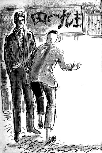 While he was waiting for a signal to change, three small Chinese boys charged a fourth who had ducked around Pendleton. They all ran around the corner and Pendleton looked after them. There was an old curio and toy shop there. He went toward its streaked window, trying to identify the objects. Some kind of procession of tin soldiers made up the main display. The door of the shop opened and an old man with a flared white beard came out. His dark suit hung loose on him and his tie was coming untied as he hurried away.