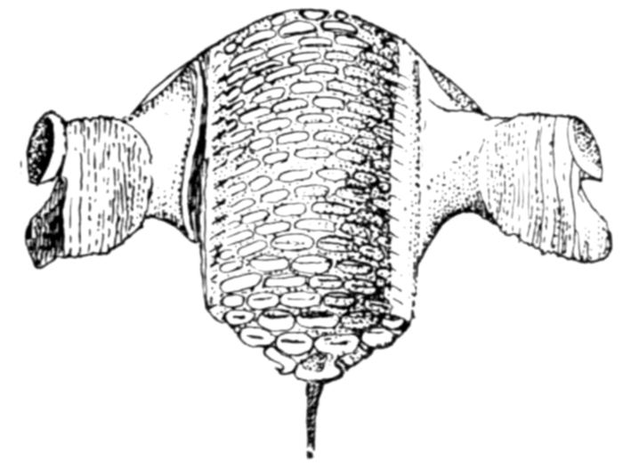 Aristotle gives, according to Professor Horace A. Hoffman, this account of the angler: "'Inasmuch as the flat, front part is not fleshy, nature has compensated for this by adding to the rear and the tail as much fleshy substance as has been subtracted from the front.' The βάτραχος is called the angler. He fishes with the hair-like filaments hung before his eyes. On the end of each filament is a little knob, just as if it had been placed there for a bait. He makes a disturbance in sandy or muddy places, hides himself and raises these filaments. When the little fish strikes at them he leads them down with the filaments until he brings them to his mouth. The βάτραχος is one of the σελάχη. All the σελάχη are viviparous or ovoviviparous except the βάτραχος. The other flat σελάχη have their gills uncovered and underneath them, but the βάτραχος has its gills on the side and covered with skinny opercula, not with horny opercula like the fish which are not σελαχώδη. Some fishes have the gall-bladder upon the liver, others have it upon the intestine, more or less remote from the liver and attached to it by a duct. Such are βάτραχος, ἔλλοψ, συνάγρίς, σμύραινα, and ξιφίας. The βάτραχος is the only one of the σελάχη which is oviparous. This is on account of the nature of its body, for it has a head many times as large as the rest of its body, and spiny and very rough. For this same 547reason it does not afterwards admit its young into itself. The size and roughness of the head prevent them both from coming out (i.e., being born alive) and from going in (being taken into the mouth of the parent). The βάτραχος is the most prolific of the σελάχη, but it is scarce because the eggs are easily destroyed, for it lays them in a bunch near the shore."