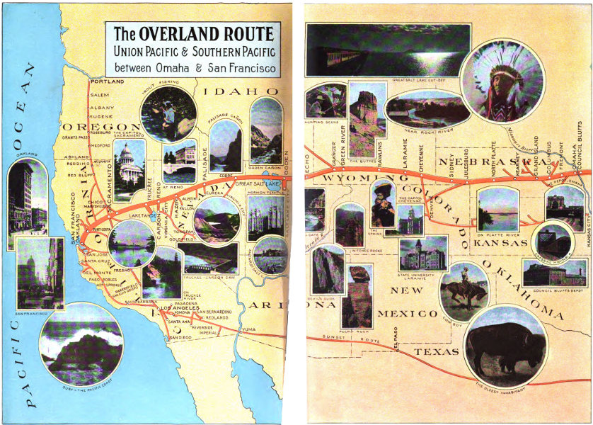 Over the wagon trail of the hardy Pioneers runs the Overland Route as pictured in these pages; over vast plains, once prairie, now farmland; past the high outpost of the Rockies; across the surface of that strange inland sea, Great Salt Lake; over the crest of the high Sierra; through picturesque canyon and valley to the Golden Gate