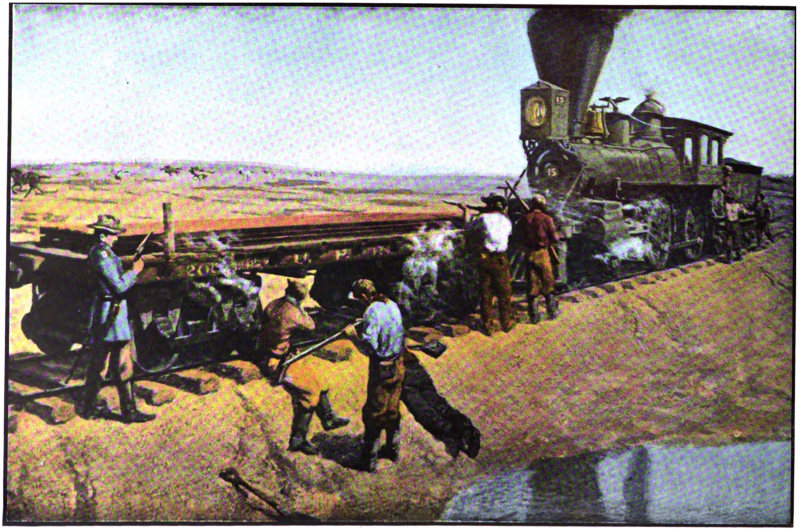 DEFENDING THE WORK TRAIN. THERE WAS AN INDIAN ARROW SHOT FOR EVERY SPIKE DRIVEN IN THE IRON TRAIL OF THE OVERLAND ROUTE. ENCOUNTERS WERE NUMEROUS AND OFTEN FATAL.