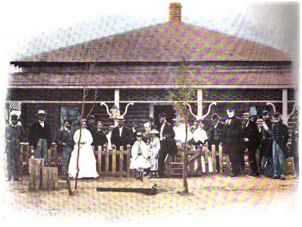 AT FORT SANDERS, A FEW MILES SOUTH OF LARAMIE, IN 1867, GENERAL GRANT AND HIS SUITE WERE PHOTOGRAPHED EN ROUTE OVER THE UNION PACIFIC TO ARRANGE TREATIES WITH THE INDIAN TRIBES WHICH OPPOSED THE RAILROAD CONSTRUCTION
