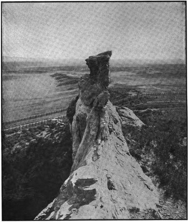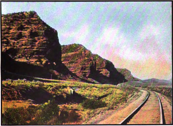 Evanston, nine hundred and twenty-seven miles from Omaha, is the end of a division, a prettily placed city with a Federal building, a Carnegie library and many natural attractions. The streams provide great trout fishing, and many hunting parties start on mountain expeditions from Evanston. Just beyond we pass Castle Rock, a symmetrical stone sentinel posted in the desert and which in the day of wagon migration was a welcome sign that not far beyond the “Promised Land” would be found. To the south lie the Uintah Mountains.