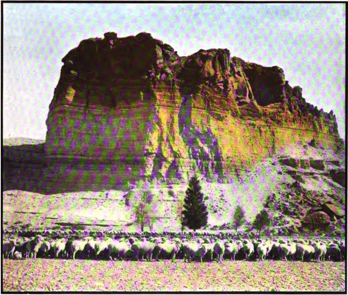 The next stop is at Rock Springs, the greatest coal mining town in the West. The town itself has the typical appearance of an active country town, and there is little on the surface to indicate the labyrinthine workings of the great underground measures, part of the vast mineral 19 treasure house of the state. Wyoming is a state of both underground and over-ground industries, with its coal mines, gold mines, copper mines, its great flocks of sheep and herds of cattle, and lastly a newly developed agricultural field of great possibilities.