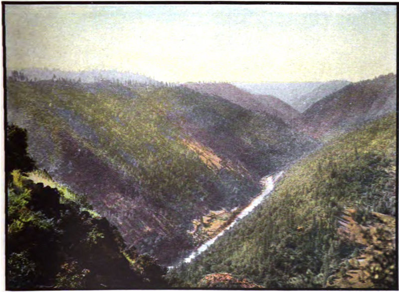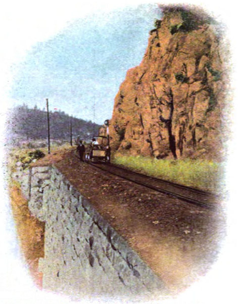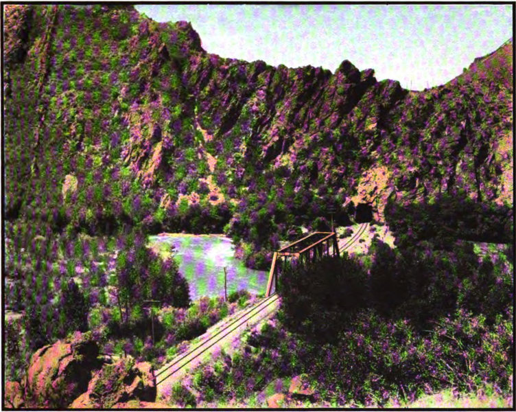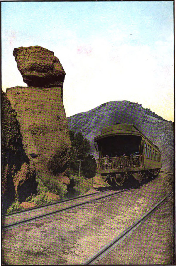 The train drops gently into Echo Canyon, running over rails alongside a mountain torrent. All along the way are Nature’s cathedrals. There are turrets and domes of gray stone, matching the architecture of an oriental city. At almost every step of the journey through the canyons are new and exquisite pictures, rock-framed, or strange monuments of stone. Immense rocks, perched on the verges of precipices, seem to threaten a fall into the abyss. The train passes under frowning cliffs, crossing and recrossing the rushing river; now by waterfalls and cascades; now bursting into a zone of sunshine, then into the twilight between 21 higher walls. The colors are the gray of rock and green of pine, with here and there a splash of iron red.