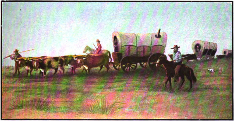 The traffic of the old trail was of long wagon trains of emigrants; of great ox outfits laden with freight for the mines; of Holladay’s coaches, six teams in full gallop, station to station; of the fast riders of the Pony Express, and of all other manner of moving men and beasts that might join the line of the westward march. Outlaws lived along the trail and as opportunity offered, plundered its followers; the protesting savages having no place upon it, but perceiving in it an instrument to alienate their dominion, burned its wagon trains and destroyed its stages as opportunity offered. At times great herds of buffalo obliterated sections of the trail. Yet it held its own until the golden spike was driven, and passed away as a wagon road only when the need for it passed. But the railway lines that took up the burden of stage coach and Pony Express and ox team, have marked the way of the trail upon the map of the West so that it shall endure as long as the West endures.