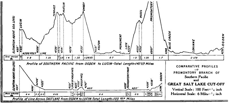From Leroy, seventy-four miles west of Green River, the new line to Bear River is taken, avoiding the old time Tapioca hill. This new stretch of road is most picturesque; the approach to the famous Aspen tunnel is through the historic Pioneer Valley, about which the train climbs with graceful sweeps. Next to the cut-off over Great Salt Lake the Aspen tunnel affords the best illustration of what genius and money may do to accomplish wonders in railway construction. The tunnel, a mile and a tenth long, passes through Aspen ridge, four hundred and fifty-six 20 feet below the mountain top and at an altitude of seven thousand two hundred and ninety-six feet. The distance saved is ten miles, the greatest grade is forty-three feet to the mile, and the sharpest curve three degrees, thirty-six inches.