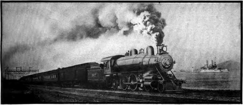 In the early days when the gold seekers sought San Francisco across the Isthmus, around the Horn, or by way of the trail, it is said that a Dutch landlord in San Francisco greeted his guests with the query: “Did you come the Horn around, the Isthmus across, or the land over?” Through some such distinction from the waterways, the wagon road from the Missouri came by its name, and to-day the railroad that succeeded it is known everywhere as the Overland Route. The railway came in the face of opposition and predictions of disaster. The builders were men to whom difficulty merely meant more effort, men who were not to be denied. The Pacific Railroads, as they were styled, were two; the Union Pacific and the Central Pacific. Starting, one from the center, the other from the extreme westward verge of the United States, they rapidly moved towards a junction; the Union Pacific being built westward 8 from Council Bluffs; the Southern Pacific eastward from Sacramento. On May 10, 1869, they met at Promontory, Utah, and then and there was signalized the spanning of the continent by the driving of the golden spike. In the presence of eleven hundred people, this last spike was driven into a tie of polished California laurel by Leland Stanford, president of the Central Pacific, and Thomas C. Durant, president of the Union Pacific. A prayer was said, the pilots of the engines touched, and a libation of wine was poured between, and the message, “The last rail is laid, the last spike driven, and the Pacific Railroad is completed,” was flashed to the President of the United States.