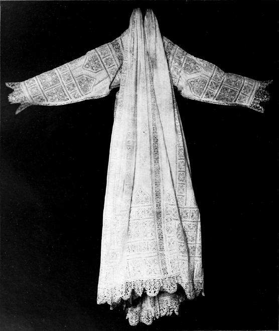I have been tempted to touch upon this matter of lace points, vandykes, and scallops because the border of the alb, said to have been worn by Pope Boniface VIII., consists of scallops of bobbin-made thread-work, and of a type of pattern and texture which I should say cannot very well be earlier in date than the middle of the sixteenth century. On the other hand, the ornamental thread-work done in "punto di treccia" and "punto a stuora," which fills large and small squares and remarkable five-sided figures, seems to have some Saracenic or Moorish character, and may possibly not be assignable to the sixteenth century with the same cogency of inference as applies to the scallops of Italian "merletti a piombini" on the border of the alb.