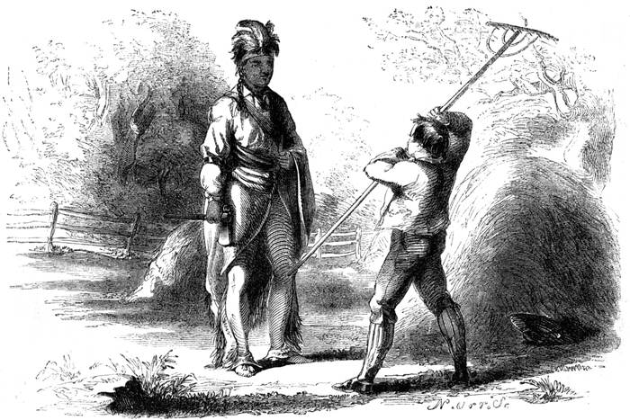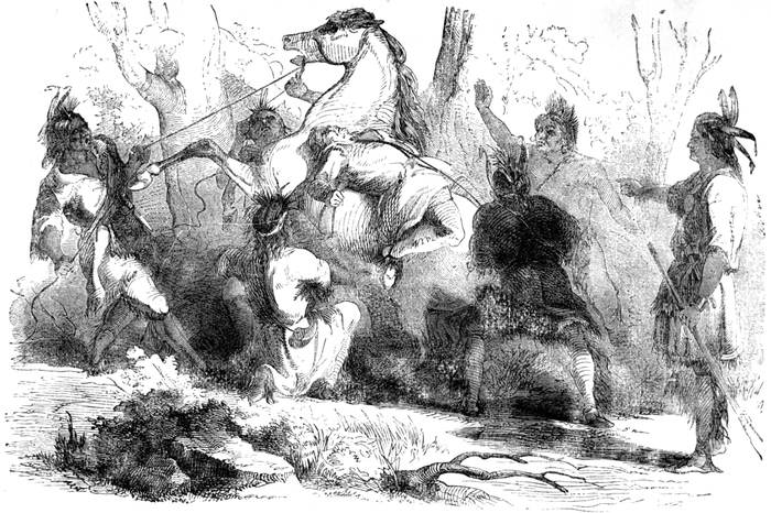 In the early light of morning breaking through the trees which surround them, a group of Indians are preparing to resume their march, after a night of repose. They have with them a solitary prisoner. Corraled about them are numbers of horses, the recovery of which has been the object of the expedition. Before these are released and the day's march resumed, the prisoner must be disposed of. While his captors are deciding this important matter, we will discover who he is and what has brought him into his present state.