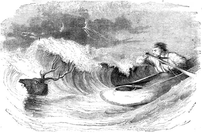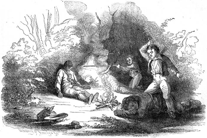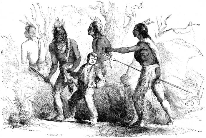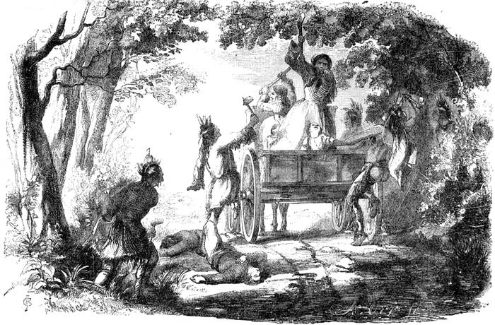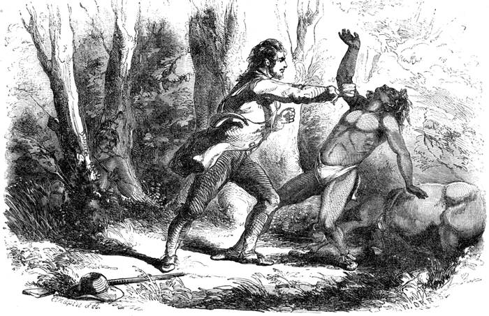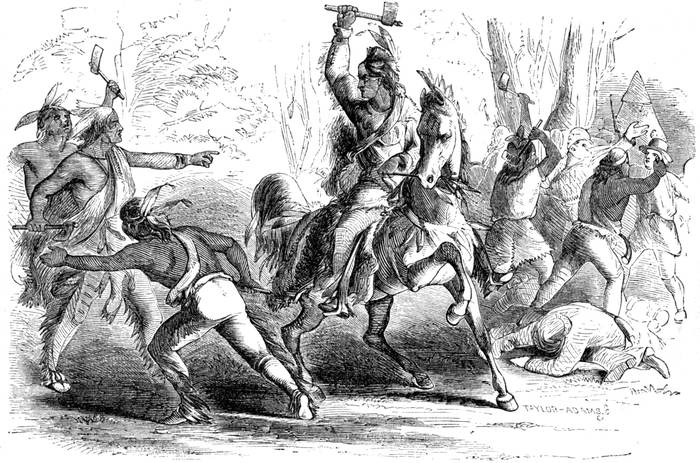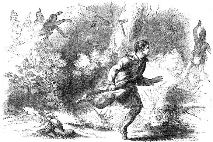6The three brave scouts reached old Chilicothe without meeting with any thing exciting. There they fell in with a drove of Indian horses, feeding on the rich prairie, and securing seven of the drove, started on their return. Reaching the Ohio, they found the river lashed into fury by a hurricane, and the horses refused to cross. Here was an unlooked-for dilemma. It was evening; they felt sure of being pursued; no time was to be lost. As the only resource, they rode back to the hills, hobbled the animals, and then retraced their steps to see if they were followed. Finding as yet no signs of pursuit, they took what rest their anxiety would allow them. The next morning, the wind having subsided, they sought their horses and again attempted to cross the river, but with the same result; the horses, from fright, refused to take to the water, and they were driven to the alternative of parting with them. Selecting each one of the best, they turned the others loose, and started for the Falls of the Ohio, (now just below Louisville); but disliking thus to abandon the fruits of their expedition, they unwisely returned again, to attempt to retake and lead the others. This was by no means an easy task, and while engaged in the endeavor, they were surprised by a party of mounted savages, who had followed their trail with vengeful pertinacity. The whites were separated; and Kenton, hearing a whoop in the direction of his comrades, dismounted, creeping cautiously in the direction of the sound, to discover, if possible, the force of the enemy. Dragging himself forward on his hands and knees, he came suddenly upon several Indians, who did not discover him at the moment. Being surrounded, and thinking the boldest game the best, he took aim at the foremost and pulled trigger, but his gun missed fire. This, of course, discovered his position, and he was instantly pursued. Taking advantage of some fallen timber, he endeavored to elude his pursuers, by dodging them, and hiding in the underbrush, where their horses could not follow; but they were too cunning, or rather too many for him. Dividing their forces and riding along either side the timber, they "beat it up," until, as he was emerging at the further end, he was confronted by one of the savages, who, the moment he discovered his white foe, threw himself from his horse and rushed upon Kenton with his tomahawk. Kenton drew back his arm to defend himself with the butt end of 7his gun; but as he was about to strike, another stalwart savage, whom he had not observed, seized him in his powerful grasp, preventing the descending blow. He was now a prisoner, compelled to yield, with such grace as he could, to superior numbers. While they were binding him, his companion, Montgomery, made his appearance, firing at one of the savages, but missing his mark. He was immediately pursued; in a few moments one of the pursuers returned, shaking the bloody scalp of his friend in Kenton's face. Clark succeeded in making his escape, and crossing the river, arrived in safety at Logan's Station.