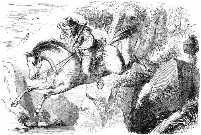 That night the Indians encamped on the banks of the river; in the morning they prepared to return with their unfortunate prisoner, who had passed an uneasy night, bound to the ground, and not knowing precisely what vengeance his enemies might be pleased to visit upon him. Some of them knew him well, and he realized that there were long scores to be wiped off against him. However, the red-man had a keen appreciation of bravery, and he did not anticipate any severer fate upon that account. Some little time elapsed before they succeeded in catching all their horses. The day had well advanced before they were ready to march, and the annoyance consequent upon this delay so exasperated them, that they determined to make their captive pay the full penalty of the trouble he had caused them. They therefore selected the wildest and most restive horse among their number, and proceeded to bind Kenton upon his back. Their mode of proceeding was as follows: a rope was first passed round the under jaw of the horse, either end of which was held by an Indian; yet even with this advantage, it required the assistance of others to control the vicious beast, which was determined not to receive its burden. Kenton was first seated upon the horse with his face toward the tail, and his feet tied together under the animal. Another rope confined his arms, drawing the prisoner down upon his back. A third, secured about his neck, was fastened to the horse's neck, thence extending longitudinally down his person to the animal's tail, where it was secured, and answered well for a crupper. In this way he was fastened to the wild and frantic steed, beyond the possibility of escape. To make the matter sure against contingencies, the now delighted savages passed another rope about 8his thighs, securing it to the one which served as a girth. They then fastened a pair of moccasins upon his hands to prevent his defending his face. During the time they were thus preparing him for his Mazeppa-like ride, they taunted him by asking if he wanted to steal any more horses. They danced around him, yelped and screamed, and, in every possible manner, expressed their infernal delight at the anticipated sufferings of their victim. The heart of Simon Kenton seldom quailed before any danger; but it must have been supernaturally strengthened not to have sickened during those moments of preparation and anticipation. To be bound to unspoken torture, which could end, at the last, only in death—death long deferred, perhaps into hours and days, whose every minute and second would be sharp with anguish—to be so helpless to resist the evils which were sure to come, with the close rope strangling the breath in his throat whenever he attempted to raise his head to see the cruelties which he felt—to add all the mental miseries of suspense to the horrible realities before him—this was enough surely to shake even the sturdy spirit of the defiant pioneer. For a moment he was inclined to beg of his tormentors to tomahawk him then and there; but he knew that such an appeal would gratify their malice while it would produce no other effect; and he closed his lips tightly, resolved that they should enjoy no sign of fear or dismay to enhance their inhuman delight. One glance at the blue sky smiling down between the lightly-waving branches of the trees—one scornful look into the demon-faces about him, and, for an instant, his eyes closed; he felt like one falling from a precipice into terrific depths yawning to receive him.