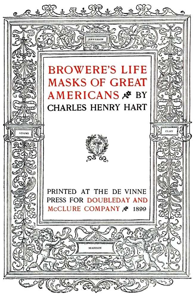 To the grandchildren of Browere, who have reverently preserved the works of their ingenious ancestor and generously placed them at my disposal for reproduction, are due the heartiest thanks; and in view of the possibility of the dispersal of the collection, it should be secured, en bloc, by the Government of the United States, and the most important of the life masks cast in imperishable bronze.