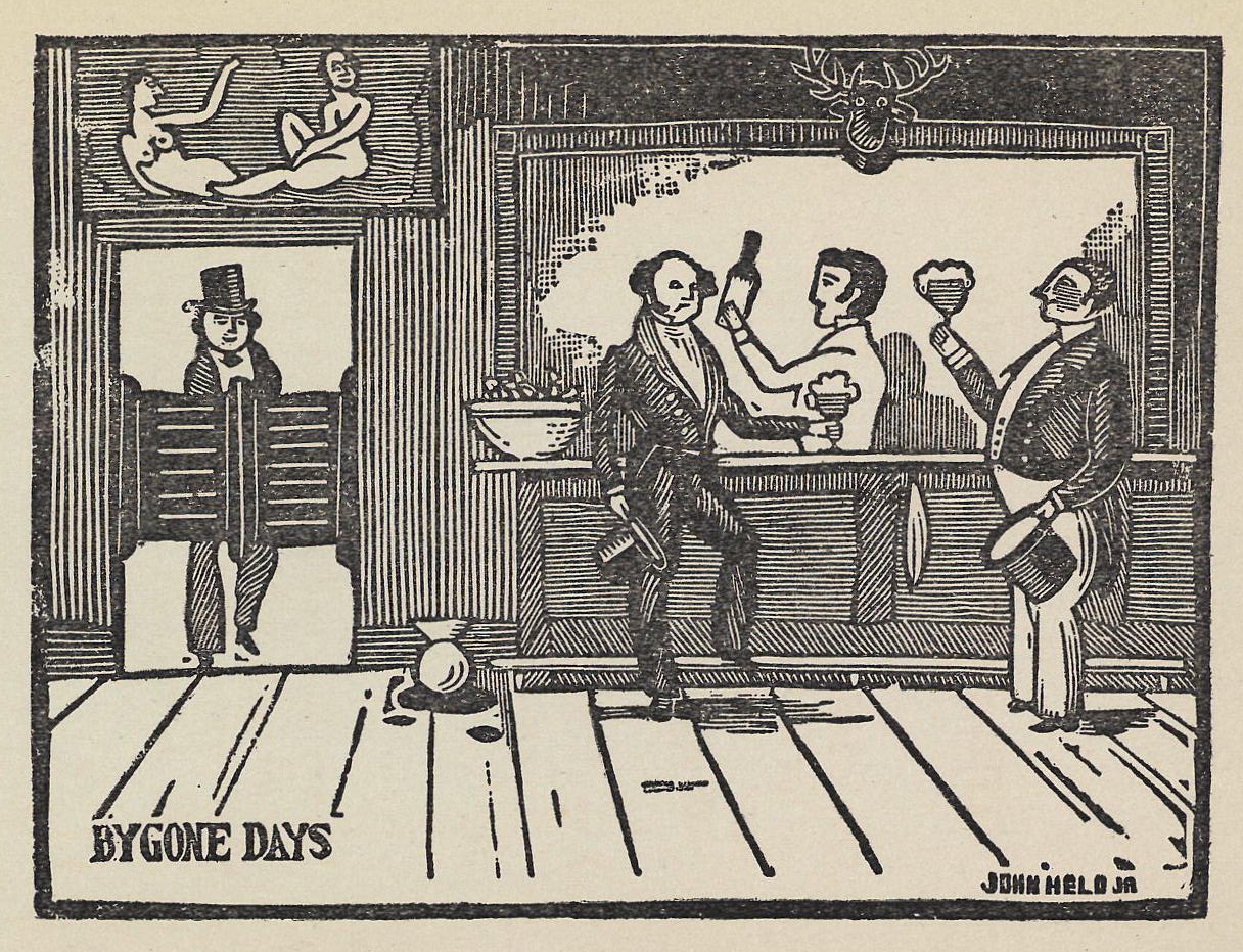 Well, I will say even if the treating habit was a great evil it is an ill wind that blows nobody any good. Well, I promised to come down to brass tacks and describe what the old-time barroom looked like. Some of the old timers had sawdust on the floor, which I never cared much for that as it never looked genteel to me and almost anything might be mixed into it.