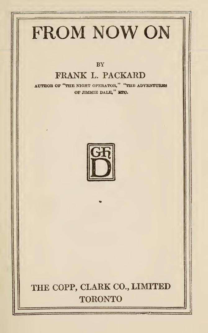 The Project Gutenberg EBook of From Now On, by Frank L. Packard This eBook is for the use of anyone anywhere in the United States and most other parts of the world at no cost and with almost no restrictions whatsoever. You may copy it, give it away or re-use it under the terms of the Project Gutenberg License included with this eBook or online at www.gutenberg.org. If you are not located in the United States, you'll have to check the laws of the country where you are located before using this ebook. Title: From Now On Author: Frank L. Packard Release Date: May 2, 2016 [EBook #51939] Last Updated: March 13, 2018 Language: English Character set encoding: UTF-8 *** START OF THIS PROJECT GUTENBERG EBOOK FROM NOW ON *** Produced by David Widger from page images generously provided by the Internet Archive