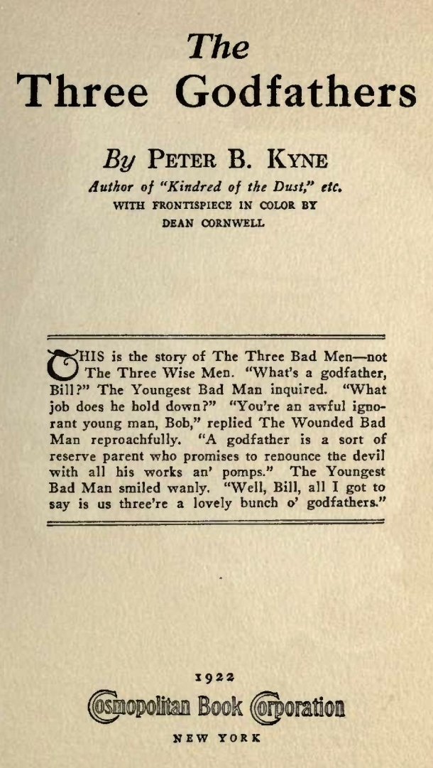 The Project Gutenberg EBook of The Three Godfathers, by Peter B. Kyne This eBook is for the use of anyone anywhere in the United States and most other parts of the world at no cost and with almost no restrictions whatsoever. You may copy it, give it away or re-use it under the terms of the Project Gutenberg License included with this eBook or online at www.gutenberg.org. If you are not located in the United States, you'll have to check the laws of the country where you are located before using this ebook. Title: The Three Godfathers Author: Peter B. Kyne Illustrator: Dean Cornwell Release Date: May 2, 2016 [EBook #51942] Last Updated: March 12, 2018 Language: English Character set encoding: UTF-8 *** START OF THIS PROJECT GUTENBERG EBOOK THE THREE GODFATHERS *** Produced by David Widger from page images generously provided by the Internet Archive