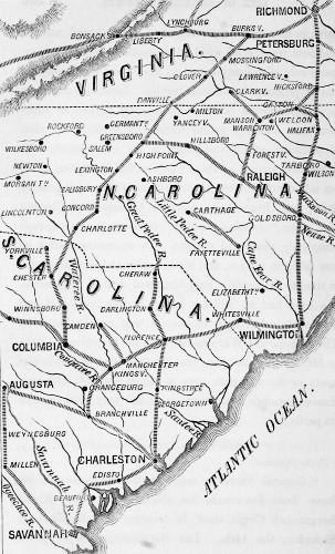 General Sherman disdained the display of success on entry into South Carolina, and remained on the hostile territory surrounded with mystery, caring only, in his own language, to do “a man’s share” in suppressing the frightful revolt. On February 19th, he was at Winsboro, thirty miles north of Columbia, on the railroad leading to Charlotte. The first telegram from him was dated at Laurel Hill, North Carolina, March 8th, saying: “We are all well, and have done finely.”