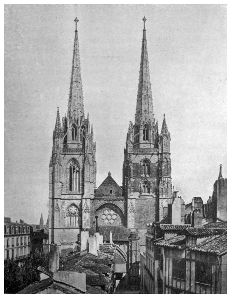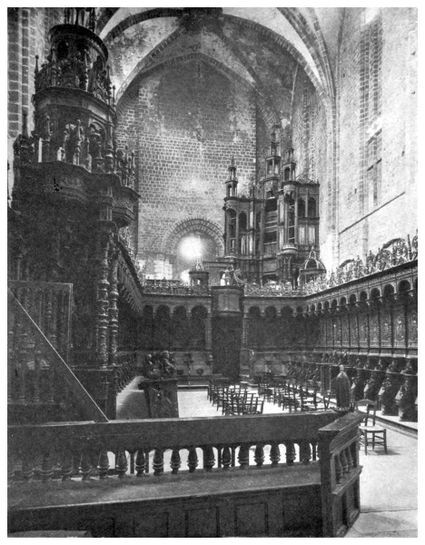 Elne occupies a sandstone rock, about which this town is built, and is divided into the upper and the lower town. It is a dull and sleepy place, that wakens into life only on the festival of SS. Eulalia and Julia, when there is much merry-making with processions, music, and dancing. Portions of the walls and some of the gates remain; but the great object of interest is the cathedral, with its superb cloisters of white marble. The exact date of the rebuilding is not known, but the church was complete in 1069. Externally it is constructed of rubble stone in herring-bone, set in mortar. The west front has a crenellated gable between two towers of unequal size and height. The loftiest is a bold structure that has had buttresses added to it much later, in 1415. The297 western doorway is unornamented. The plan of the church is a nave with side aisles and no transepts. It is very plain within as without, with huge piers supporting round-headed arches and vault. The high altar was of silver, and dated from 1069, but was sent to the mint at Perpignan to be coined into money in 1721. The new altar-piece is as Prosper Mérimée described it—“a masterpiece of meanness and bad taste.”