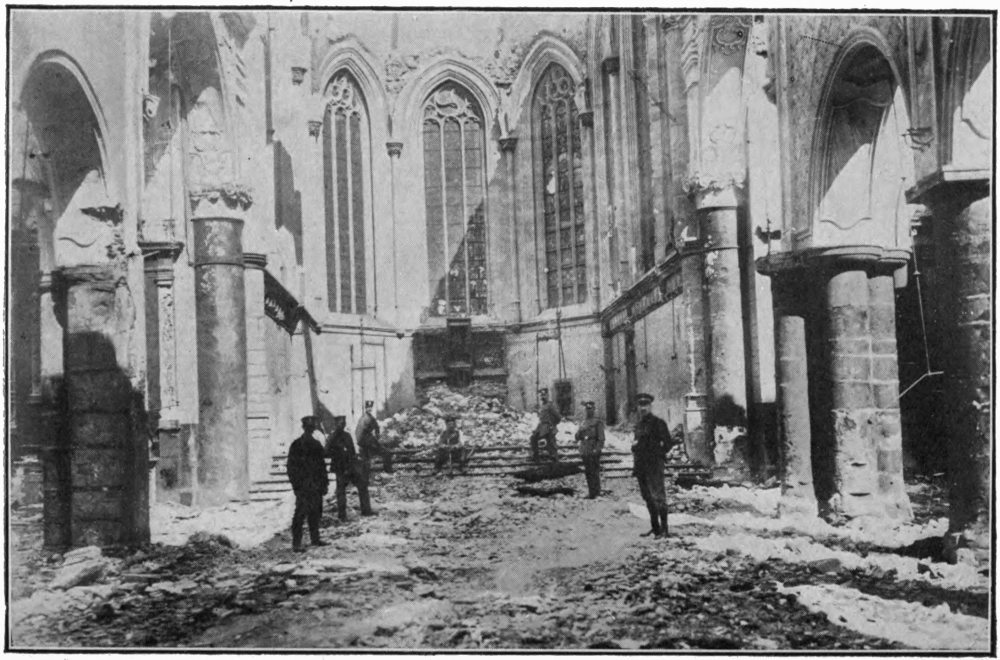 The German troops allowed no considerations of religion or respect for antiquity to interfere with their scheme of devastation. Great works of art and architecture and ancient churches were destroyed by fire or shell, and in more than one instance it is stated that cathedrals were used for stabling horses. To-day many are the ruined churches in Belgium. Of the beautiful cathedral of Louvain only the walls stand, for the interior is reported to have been ruthlessly shelled, pillaged, and finally set on fire. Other churches in the ill-fated city similarly suffered, while at Malines, too, bare walls and loose masonry are all that remain of what were until recently sacred edifices of exceptional interest to visitors by reason of their ancient treasures.