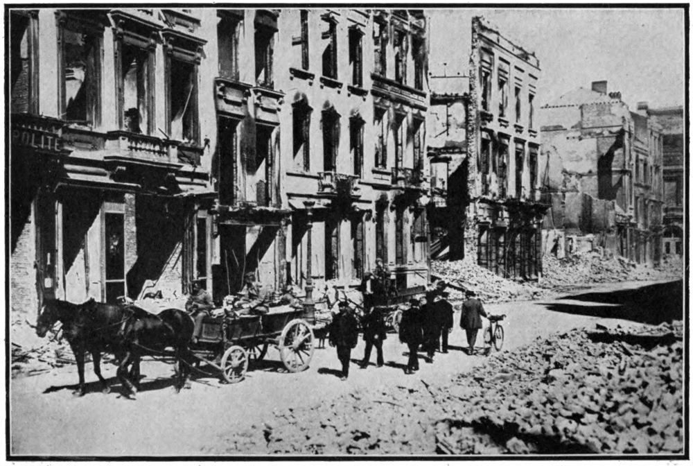 The story of that terrible night would not, however, be complete without a reference to the miraculous escape of M. Vamberg, a cigarette-maker. Had he slept in the bed he usually occupied, he would now be a dead man. But for some reason he chose another bed in another room, his wife being absent in the country, and so saved his life. The bed which Mme. Vamberg occupies when at home was crushed by the falling roof. More than that,{122} having been aroused by the sound of the cannon, and having jumped out of bed and rushed down to the first floor, M. Vamberg found himself suddenly hanging from the window, the house having fallen about his ears. He was rescued from this position by the firemen.