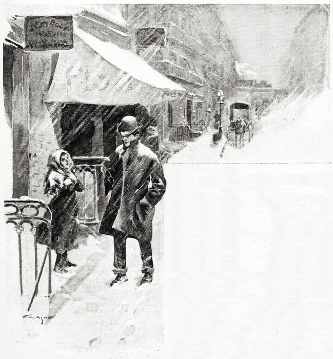When he reached Houston Street he travelled westward for several blocks, until he came into a very poor district crowded with dingy tenement-houses that leaned against one another in an uneven sort of way, as if they were tired of the sad kind of life they had been witnessing for so many years. The snow that had piled up on the window-sills and over the copings seemed to brighten up the general aspect of the quarter, because it filled in the cracks and chinks of material misery, and made the buildings look at least temporarily picturesque, just as paint and powder for a time may hide the traces of old age and sorrow. Fred found the number 179 painted on a piece of tin that had become bent and rusty from long service over a narrow doorway, and as he stood there comparing it with the number given in his clipping, a little girl with a shawl drawn tightly over her head and around her thin little shoulders came out of the dark entrance and stopped on the door-sill for a moment, surprised, no doubt, at the sight of the tall rosy-cheeked young man so warmly clad in a big woollen overcoat that you could have wrapped her up in several times, with goods left over to spare.