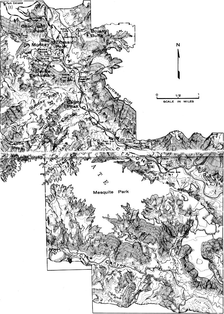 There are a number of established trails for the visitor who is interested in hiking. The more popular trails include those to the Spanish Skirts and Catarina Cave (p. 37), the Devil’s Tombstone, the Lighthouse (p. 39), and the Devil’s Slide (p. 40). Park rangers will be glad to provide more complete information about these and other trails within the canyon.