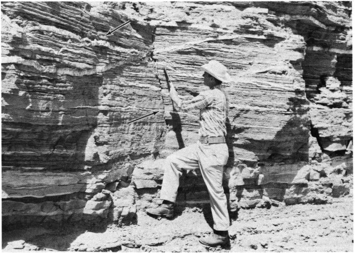 As noted earlier, sediments are usually laid down in horizontal layers. However, in certain environments, sediments may be deposited in such a way that the layers are inclined at angle to horizontal (fig. 11). This structure, called cross-bedding or cross-stratification, is found in certain sandstones and other coarse-grained or fragmental sedimentary rocks. Cross-bedding typically consists of rather distinct inclined layers separated by bedding planes (the surface of demarcation between two individual rock layers). Bedding of this type commonly occurs in sedimentary rocks formed in rivers, deltas, and along the margins of lakes or oceans. The cross-bedding in the Quartermaster and certain of the Triassic formations is believed to have been developed under similar conditions. Although cross-bedding is also common in certain rocks of eolian origin (deposited by wind) none of the cross-bedding in the canyon’s rocks is due to the action of wind.