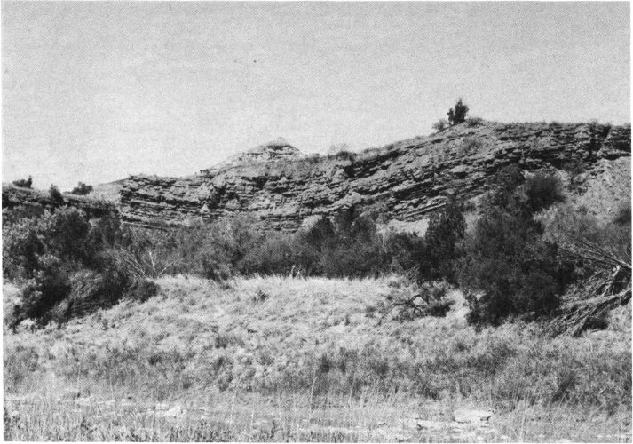 The basal Trujillo sandstone is one of the most conspicuous rock units in the canyon and forms many of the prominent benches and mesas so typical of the Palo Duro landscape. In places the sandstone is cross-bedded (p. 20) and contains channel deposits of coarse sand which suggest that the sediments from which it was derived were deposited in ancient stream beds.