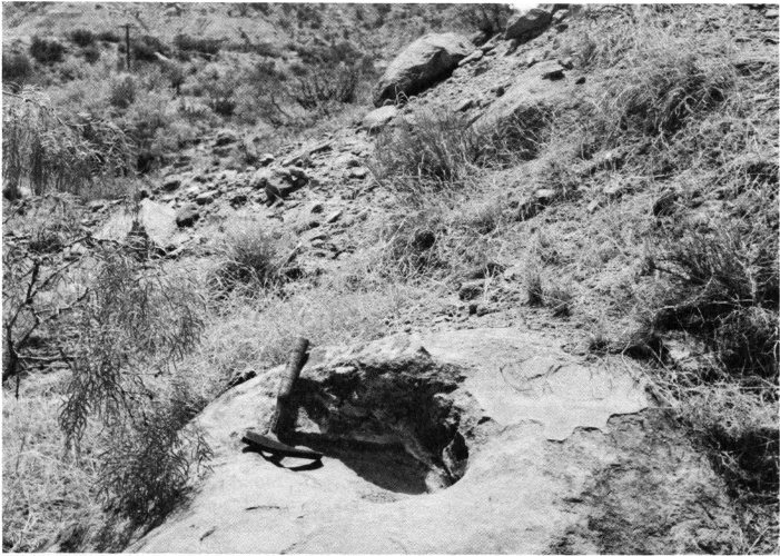 The Indians who formerly inhabited the Palo Duro area (p. 3) put the rocks of the canyon to a number of uses. This appears to be especially true of the rather coarse-grained Trujillo sandstones, which were commonly used for constructing primitive rock shelters. The abrasive surface of the sandstone was especially well suited for grinding grain, and mortar holes have been found in a number of places. One of these (fig. 15) can be seen along the tracks of the Sad Monkey Railroad (p. 35) near the foot of Triassic Peak. The Indians also used the clays of the Quartermaster, Tecovas, and Trujillo Formations to make pottery, and iron and copper minerals such as hematite and malachite were used to make red and green pigments for decoration and war paint.