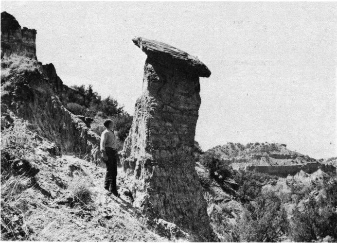 The Trujillo shales and sandstones can be seen in a number of Palo Duro’s more spectacular geological oddities. These erosional remnants are best developed where blocks of erosion-resistant sandstone protect underlying pedestals of softer shale (fig. 15). This type of differential weathering (p. 31) has produced a number of interesting and unusually shaped pedestal rocks or “hoodoos” (figs. 16 and 20). The most spectacular erosional remnant—and one that has come to be the “trademark” of Palo Duro Canyon—is the Lighthouse (fig. 31). The great jumble of boulders called the Rock Garden (fig. 34) is also composed largely of massive blocks of dislodged Trujillo sandstone. These boulders accumulated on the canyon floor as a result of landslides. In addition, the rock profile known as Santana’s Face (fig. 28) is a naturally sculptured profile in the Trujillo sandstone that forms the cap of Timber Mesa.