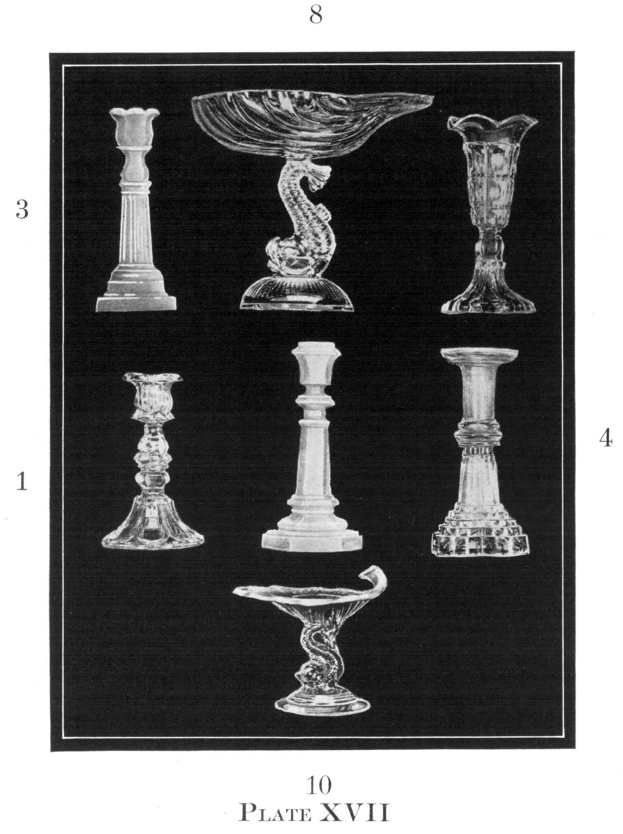 Illustration No. 9 page 70 is so far as the author knows, the only lamp which has been found with a single Dolphin base. It is of clear white glass and is a beautiful piece.