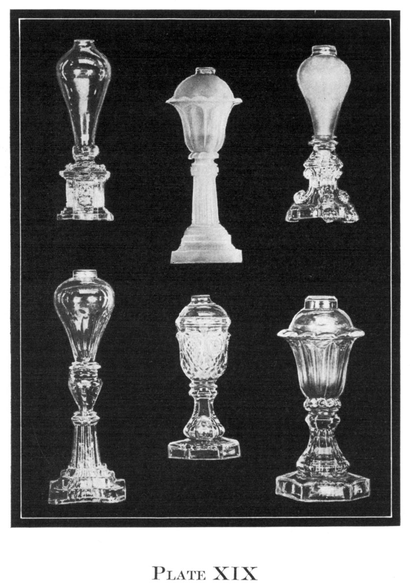 A burner was invented consisting of two tin tubes soldered to a brass or pewter screw cap. This took the place of the single tube of the earlier lamps and gave a double flame. It was adaptable to use in lamps of ornamental glass and the enterprising Sandwich factory at once started the manufacture of pressed glass lamps to meet the demand.