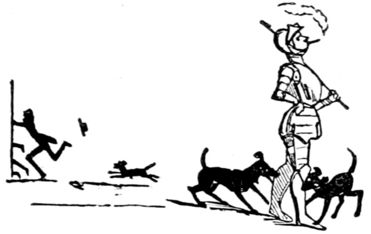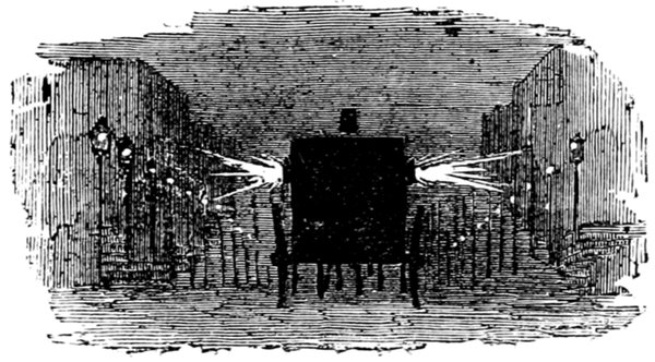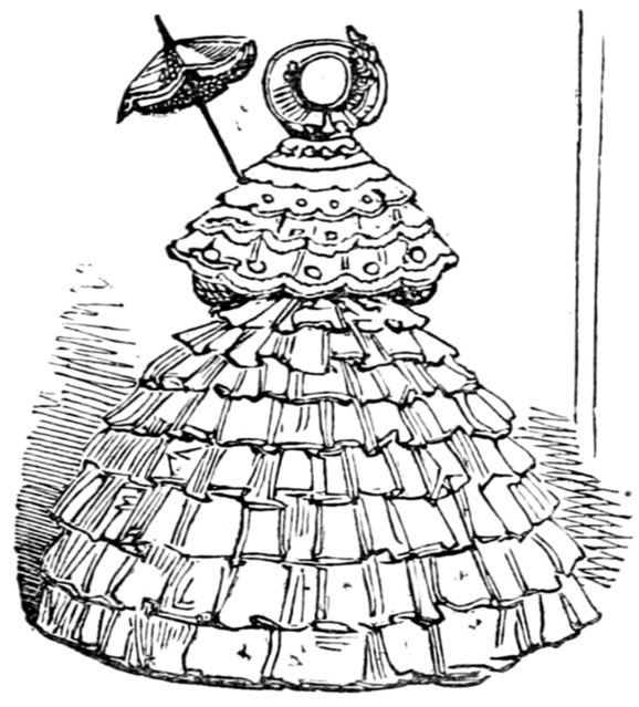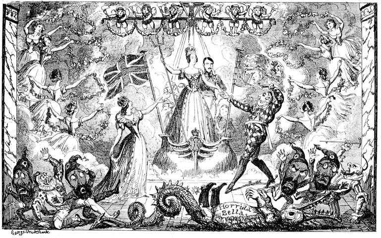 The play of "Macbeth," from the text of Shakspeare, now proceeded, and the manager's candour in using the disjunctive from was speedily visible. The ambitious thane wore a plaid shawl, commonly called a horse-cloth, and a pair of stocking-drawers, with a breast-plate formed of the brass ornaments used to cover the screws of tent bedsteads. The scene with the witches was thrown into such confusion by the performers not knowing their parts, that it was impossible to say which was witch, and, by way of an overflow at half-price, the rain came on in such torrents at about half-past eight, that in the fourth act Macbeth came on under an umbrella, beneath the shelter of which he concluded the performance. The damp thus thrown on the efforts of the new lessee brought the season to a precipitate close, and Doublethrust abdicated the managerial throne after a short rain, but by no means a merry one.
