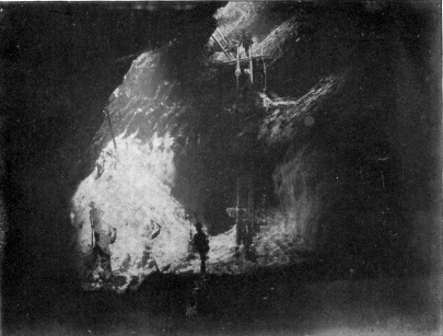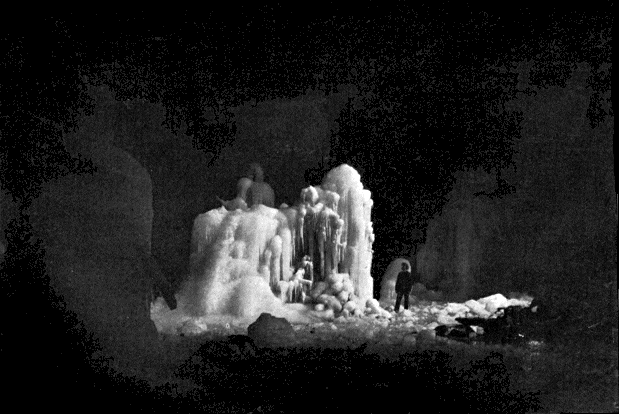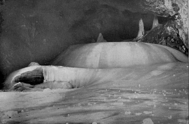 After a descent of some twenty-five meters or thereabouts, we arrived at the glacière, and I have certainly never seen a weirder place. There was a great arched rock dome, perhaps six meters in height, and some twelve in diameter; the floor was a sheet of smooth, slippery ice, at one end curling over, gently at first, afterwards more steeply, to a lower depth; and on the sides were seven or eight ice columns streaming from cracks in the rocks to the floor. Each of these columns was some three or four meters high, and, small at the top and in the middle, spread out at the base into the shape of fans. In the dim candle light and the cold damp atmosphere, the columns loomed up like so many ghosts, and the landscape impression was strange and solemn. The air here seemed perfectly still.