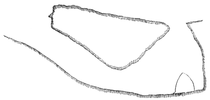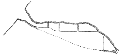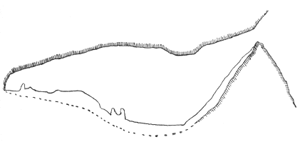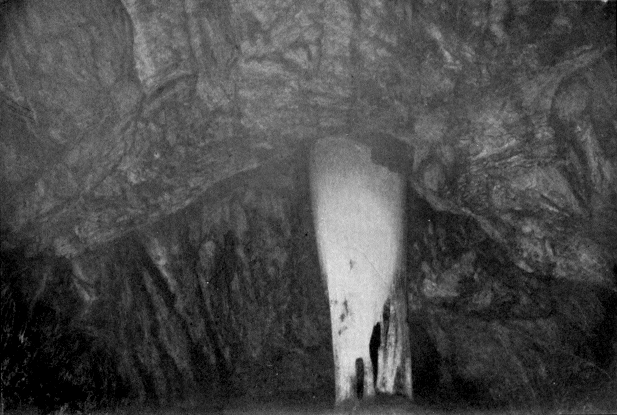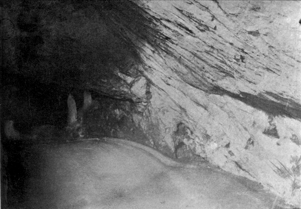 The fissure led straight into the mountain. It was a couple of meters wide at places, and there we moved along the bottom. In one place it narrowed below to a wedge, and there we progressed either by climbing along one side or by placing one foot on one side and the « 7 » other foot on the other. The fissure led downwards as well as inwards. It would have been nothing in daylight to go through it; but in the semi-darkness it was not easy.