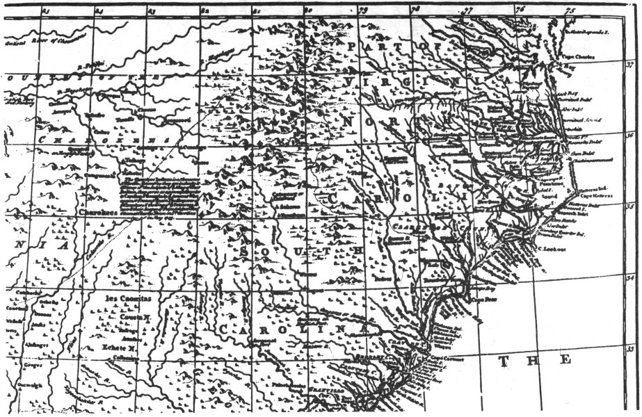 The map gives a grand and sober image of the New World. In the west are the great “Charokee Mountains.” Individual peaks are shaded on one side, making them seem massive and solid as they thrust up forcibly from the land. At the eastern side of the range are little trees, delicate signs of green timber growth. Big letters tell us that “Virginia” is at the north, “North Carolina” is in the middle area, and “South” indicates the beginning of South Carolina, below. A meandering, dotted line bounds North Carolina, which was not considered as extensive then, as it is today.