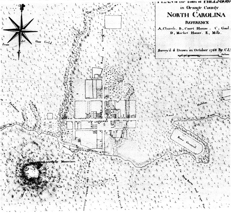 The little town is shown on the Eno River in the wooded land of Orange County. The big star at upper left shows north, south, east, and west, and one notes that the town seems to be laid out “properly” on these directions. Roads leading to neighboring towns are carefully marked. There are the Roads from Salisbury ... to Virginia ... to Halifax ... to New Bern ... to the Quaker Settlement ... to Cross Creek. At lower left is “Oakaneetche Mountain,” a great 10 hump of earth overlooking Hillsboro. Another of the Occoneechee mountains is seen at the edge of the map. The Occoneechee Indians were one of several Indian tribes in the area. Today, boy scouts in this part of Orange County belong to the Occoneechee Council. They sometimes have camporees at the Hillsboro race ground, not far from the “Race Ground” marked on our map. This Race Ground lies neatly within a bend in the Eno River, as though the river wanted to mark out this area of flat land for such special use. Scattered here and there outside the town are farms. The rectangular plots of farm land are clearly marked, and the farm houses and secondary buildings are placed at corners convenient to the road.