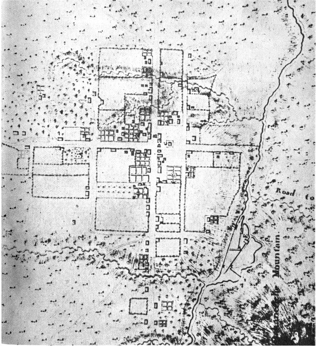 For our study of colonial towns we are fortunate in having beautiful maps of ten North Carolina towns, all made by the surveyor Claude Joseph Sauthier. The Hillsboro map, figure 3, is one of these drawings. Sauthier traveled over North Carolina between 1768 and 1770, surveyed and made maps of Bath, Beaufort, Brunswick, Edenton, Cross Creek (now Fayetteville), Halifax, Hillsboro, New Bern, Salisbury, and Wilmington. The drawings were commissioned by Governor Tryon; most of them have found their way to the great British Museum, in London.