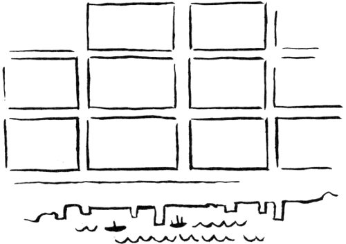 Figure 7, to suggest the plan of a port town, seems like half of the inland plan, above. A principal street of the town runs along or near the water. It might be called Water Street, as at Bath.