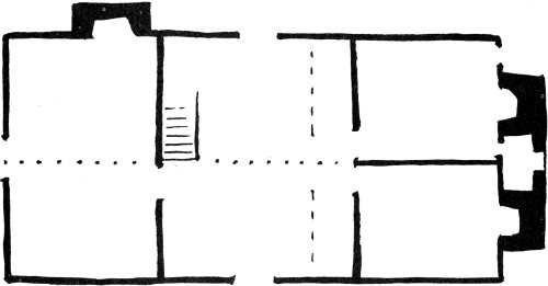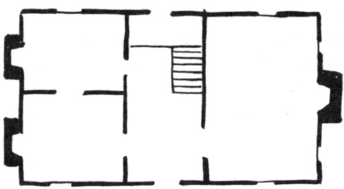 Figure 13 shows the back of the house, with its famous double chimney, an unusual feature rarely found. The windows in the chimney give light to closets on the first and second floors. In the plan of the first floor, figure 14, it may be seen how a closet is placed between two bedrooms, serving one of them. On the floor above, the closet serves the bedrooms on the other side, thus demonstrating a desire to play fair with bedrooms on both sides of the house.
