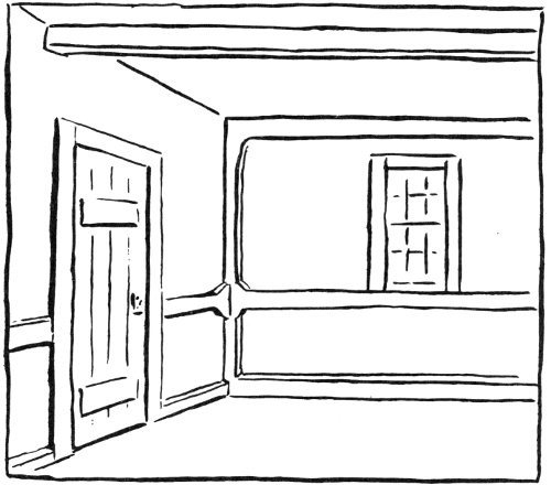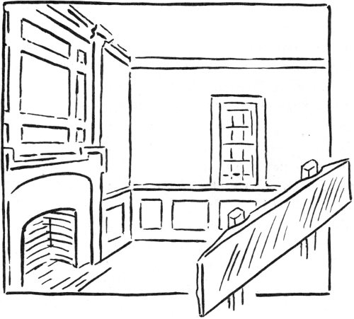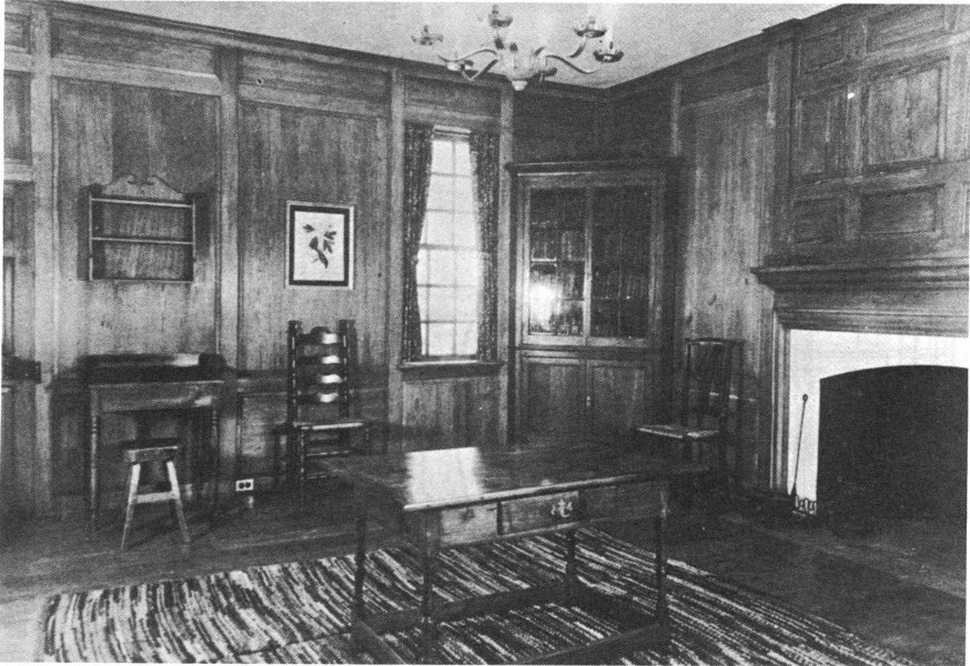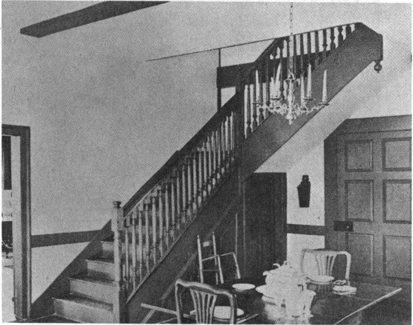 Figure 15 shows an interior of the Palmer house. Glance at the plan, figure 14, and see how this room fits within the total house. Notice the great beam running across the ceiling and, parallel with it, the beam at the side wall. Notice also that the side entrance door is framed at the right by a post which rises to the ceiling. Such exposed beams and posts suggest the wood skeleton of the house. Skeletal structure is concealed in most colonial homes that remain today, but is found occasionally as here in the Palmer house. More will be said later about exposed construction and about interiors.